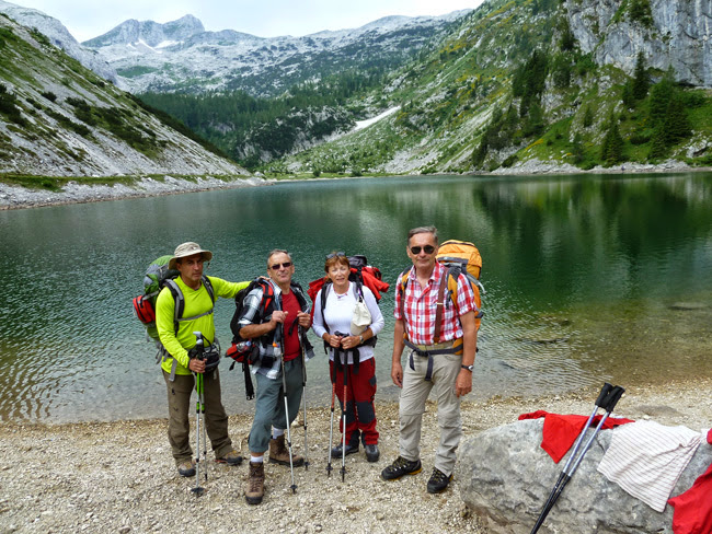 Krnsko jezero nalazi se na podnožju Krna između planine Lemeža i Šmohorja. Ono je najviše slovensko alpsko jezero, dugo 300 m i široko 150 m, sa najvećom dubinom od 18 m. Na jezeru pravimo veću pauzu ( 45 minuta) uz marendu i hlađenje nogu u jezeru. Sredina je tjedna i nema mnogo posjetitelja na jezeru. Odmoreni i osvježeni, željeli smo napraviti jednu lijepu zajedničku fotografiju za buduća sjećanja i zamolili smo jednu od dvije slovenske planinarke da nas fotografira.